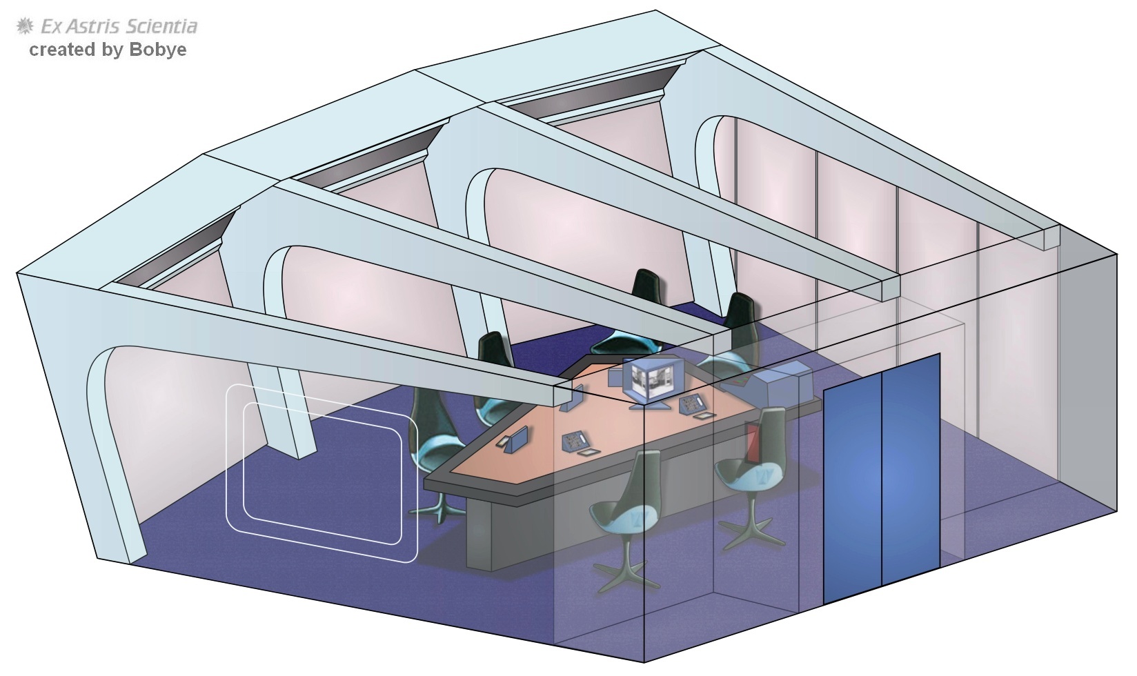| Description | The two briefing rooms serve as multipurpose spaces aboard ship and are utilized for everything from meetings to formal functions. The standard configuration for the space allows for 5 officers around a pentagonal wood veneered table. Each room is equiped with a viewscreen. |