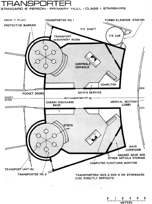 | Description | The current configuration of the Constitution class incorporates 3 transporter rooms, 1 on Deck 3 and 2 twinned rooms located on Deck 7 close by to the Medical section. Each room allows for 6 personnel to beam down at once. |